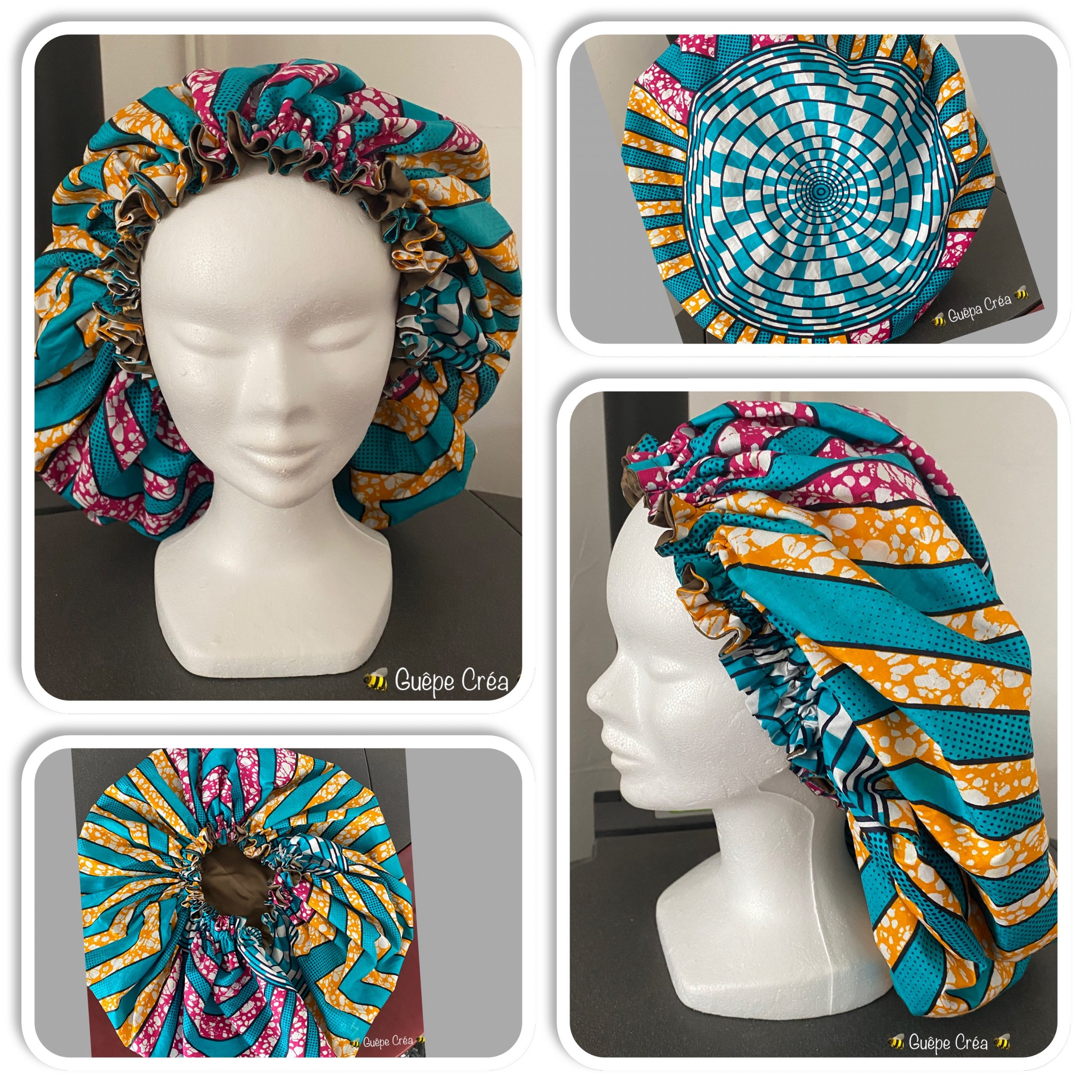 Bonnet pour chevelure, en wax et satin avec élastique.