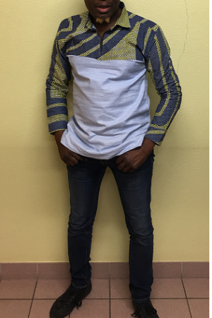 Mélange lin et wax chemise homme ouverture fermeture poitrine manche longue.